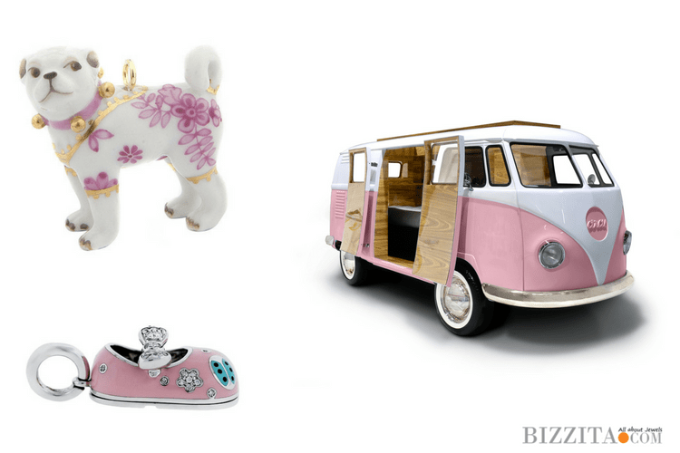 Dog pendant in gold and porcelain by Meissen, 18kt white gold, and enameled shoe with diamonds by Aaron Basha, VW van bed by Circu