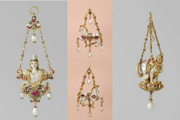 Hippocamp from the Hermitage, St Petersburg, two pendants a horse and a rabbit (?) in large natural baroque pearls and gold, Florence 1590 and one of the most alluring pieces I have ever seen: Hippocamp, Erasmus Hornick, Spain 16th Century